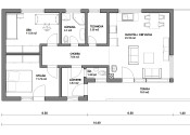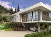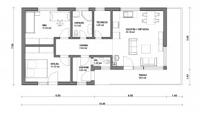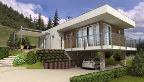 Na uvedenom pozemku Vám vieme zabezpečiť VÝSTAVBU rodinného domu – individuálny alebo katalógový projekt. Ilustrovaný projekt rodinného domu je kompaktný 3 izbový bungalov s pragmatickou dispozíciou a terasou 18,9m2. Dom vhodný do svahovitého terénu: