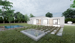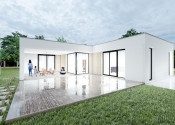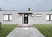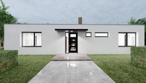 Realitná kancelária REG4U Vám ponúka na pozemku v okolí Púchova VÝSTAVBU RODINNÉHO DOMU - kompaktný 4 izbový rodinný dom typ NKM 03 s plochou strechou a veľkou terasou: