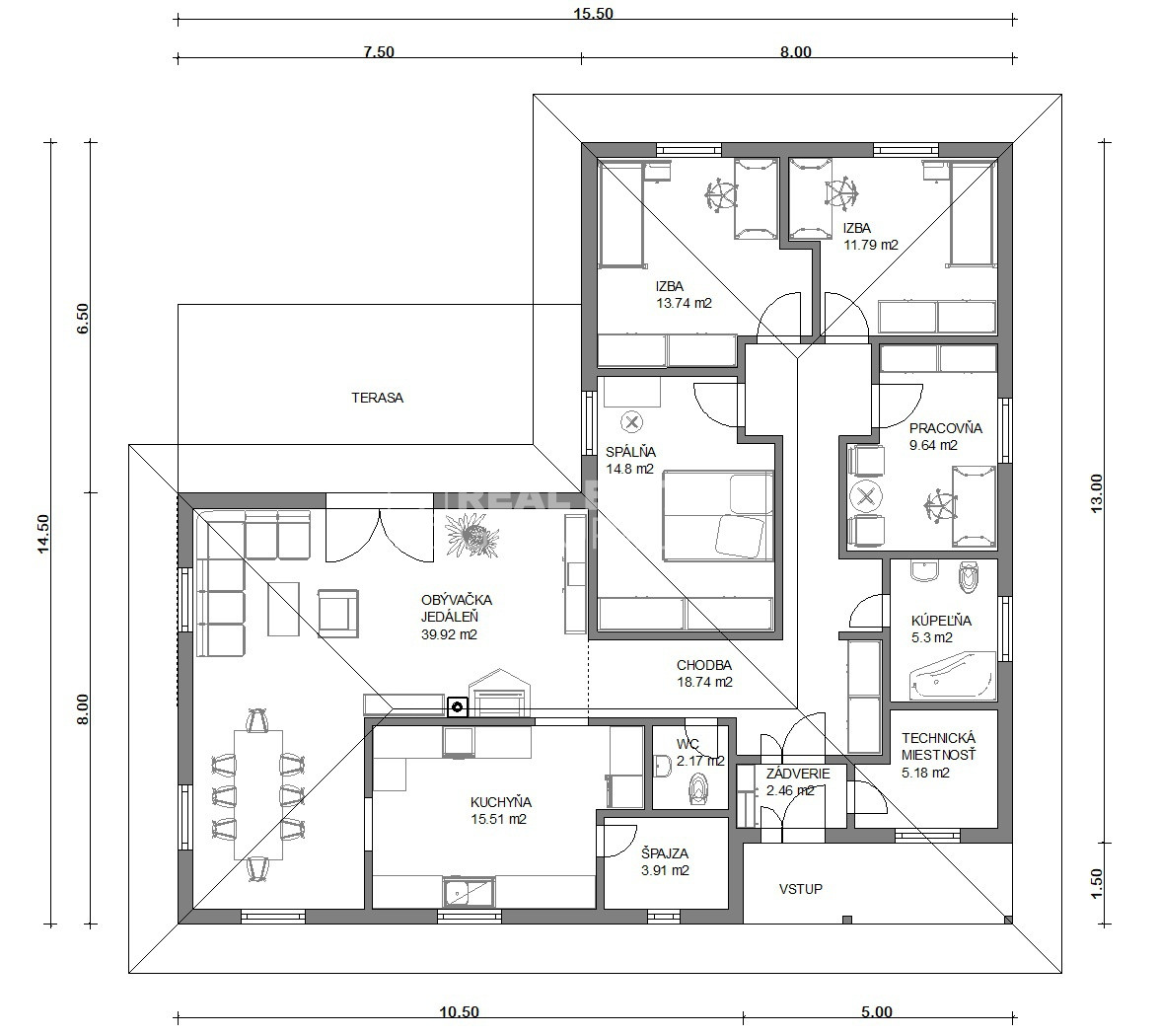Realitná kancelária REG4U Vám ponúka na pozemku v okolí Považskej Bystrice VÝSTAVBU RODINNÉHO DOMU - 5 izbového bungalovu typ VDT 07 s terasou v tavre "L" s rozmermi 6,5 x 7,5 m: