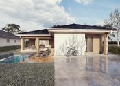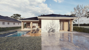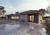 DISPOZÍCIA DOMU: Zo zádveria domu, ktorého súčasťou je väčší odkladací priestor a samostatné WC sa vstupuje do chodby, kde sa po ľavej strane nachádzajú 2 detské izby a po pravej technická miestnosť a kúpeľňa so sprchovacím kútom a wc. Z detských izieb je výstup na terasu. Dennú časť tvorí obývacia izba s kuchyňou a jedálňou. Z obývacej izby sa posuvnými HST portálovými dverami vstupuje na prekrytú terasu. Súčasťou kuchynskej linky sú integrované dvere, za ktorými sa nachádza úložný priestor špajze. Spálňa rodičov je oddelená od priestoru detských izieb a jej súčasťou je samostatný šatník a kúpeľňa so sprchovacím kútom.