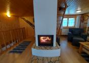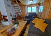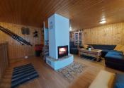 1 NP: centrálna, presvetlená obývacia miestnosť s TV, krbom s východom na balkón, ktorý sa ťahá po 2 stranách chaty.
