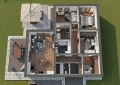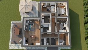 Pôdorys domu je navrhnutý do tvaru písmena L. Hlavný vstup je zo severovýchodnej strany do zádveria (3,51 m2) a následne do chodby (12,37 m2) odkiaľ je prístup do všetkých izieb (pracovne - 8,19 m2, izieb - 12 m2 a 11,85 m2 a spálne 12,74 m2) a kuchyne spojenej s obývacou izbou (30,15 m2). Integrovaný vstup do špajze (2,16 m2) cez kuchynskú linku. Z obývacej izby vedú terasové dvere do exteriéru. Z bočnej a zadnej časti domu je prístup do záhrady cez navrhované terasy. Z chodby je ďalej prístup do kúpeľne s WC, sprchovacím kútom a vaňou (7 m2) , samostatného WC (1,62 m2) a technickej miestnosti (5,54 m2), v ktorej sa nachádza výlez do podkrovia, riešený sklopným schodiskom. Z čelnej strany je vjazd na pozemok s parkovacím státím pre dve autá.