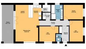 Základy domu - základové pásy; štrkové lôžko; železobetónová doska; obvodové murivo – 30mm tehla, priečkové murivo - tehla; tepelná izolácia vonkajšia – 150 mm polystyrén biely (EPS) + silikónová omietka; podlaha terasy betónová; stropy – sádrokartón; steny: vápenno-cementová omietka; podlaha keramická dlažba: zádverie, technická miestnosť, kúpeľňa, WC (Geberit), špajza; podlaha laminát: obývacia izba, kuchyňa, spálňa, izby, chodba; realizácia pokládky keramického obkladu a dlažby v kúpeľni a vo WC. Kompletná elektroinštalácia: Legrand, vykurovanie podlahové elektrické odporové, zásobník TÚV - elektrický bojler. Strecha: hambálkový krov, krytina betónová. Okná plastové biele, trojsko, 6 komorové. Interiérové dvere s oblôžkami. Predpríprava na krb. Finančný balík na povrchové úpravy a sanitárne vybavenie kúpeľne a wc vo výške 1500.-€ v cene.