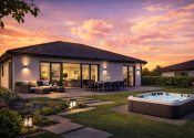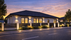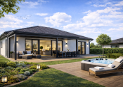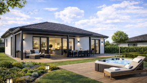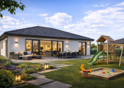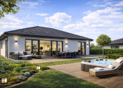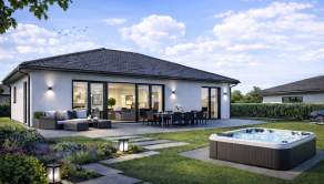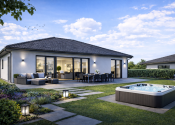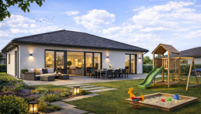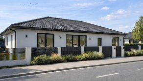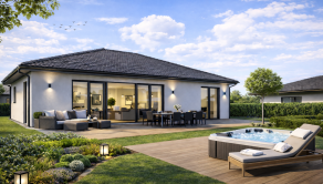 Realitná kancelária REG4U Vám ponúka na pozemku v okolí mesta Bánovce nad Bebravou VÝSTAVBU RODINNÉHO DOMU. Tento moderný bungalov typ DHRO ponúka harmonické spojenie nadčasového dizajnu a maximálneho pohodlia. Svetlá fasáda, čisté línie a elegantná valbová strecha vytvárajú príjemný, reprezentatívny vzhľad. Dominantou nehnuteľnosti je priestranná denná časť s veľkoformátovým presklením, ktoré zabezpečuje dostatok prirodzeného svetla a zároveň poskytuje krásny výhľad do záhrady. Terasa ponúka komfortné vonkajšie sedenie.