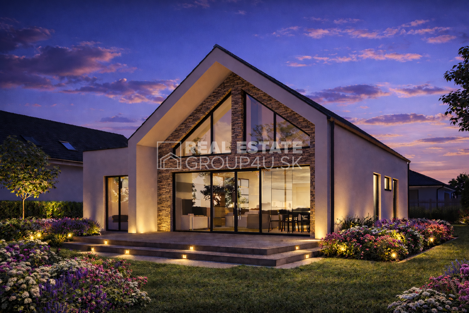 Navrhnutý moderný, nadčasový 4-izbový bungalov s dôrazom na čisté línie, svetlo, priestor a plynulé prepojenie interiéru s exteriérom, ktorý spája krásu dizajnu s pohodlím každodennej reality. Dominantou bungalovu je impozantné presklenie cez dve podlažia, ktoré zabezpečuje výnimočné presvetlenie interiéru a zároveň vytvára jedinečné prepojenie obytného priestoru so záhradou.