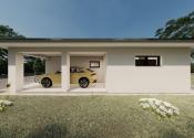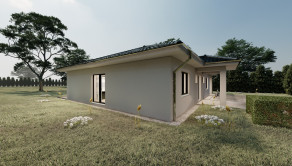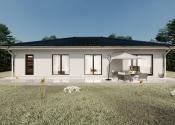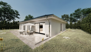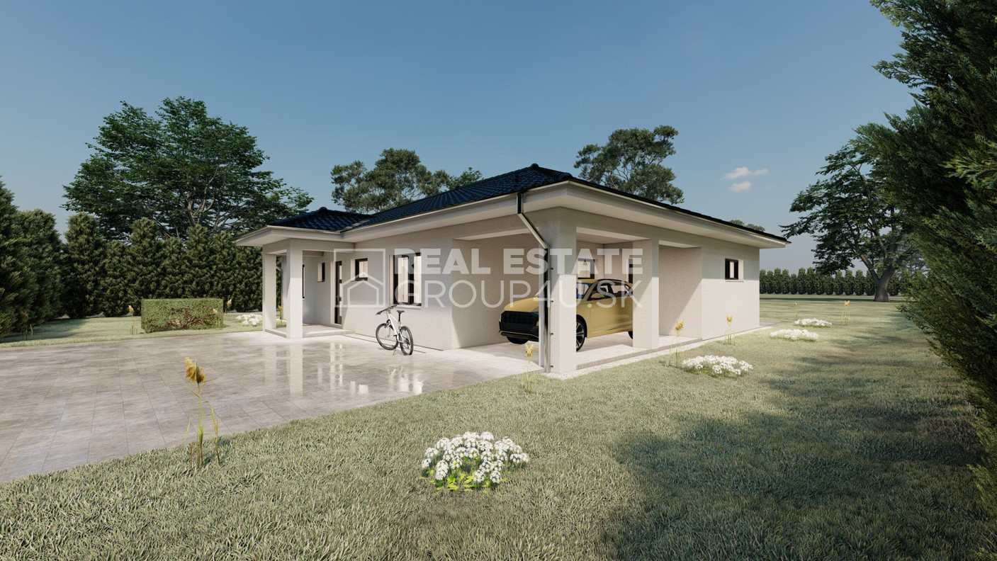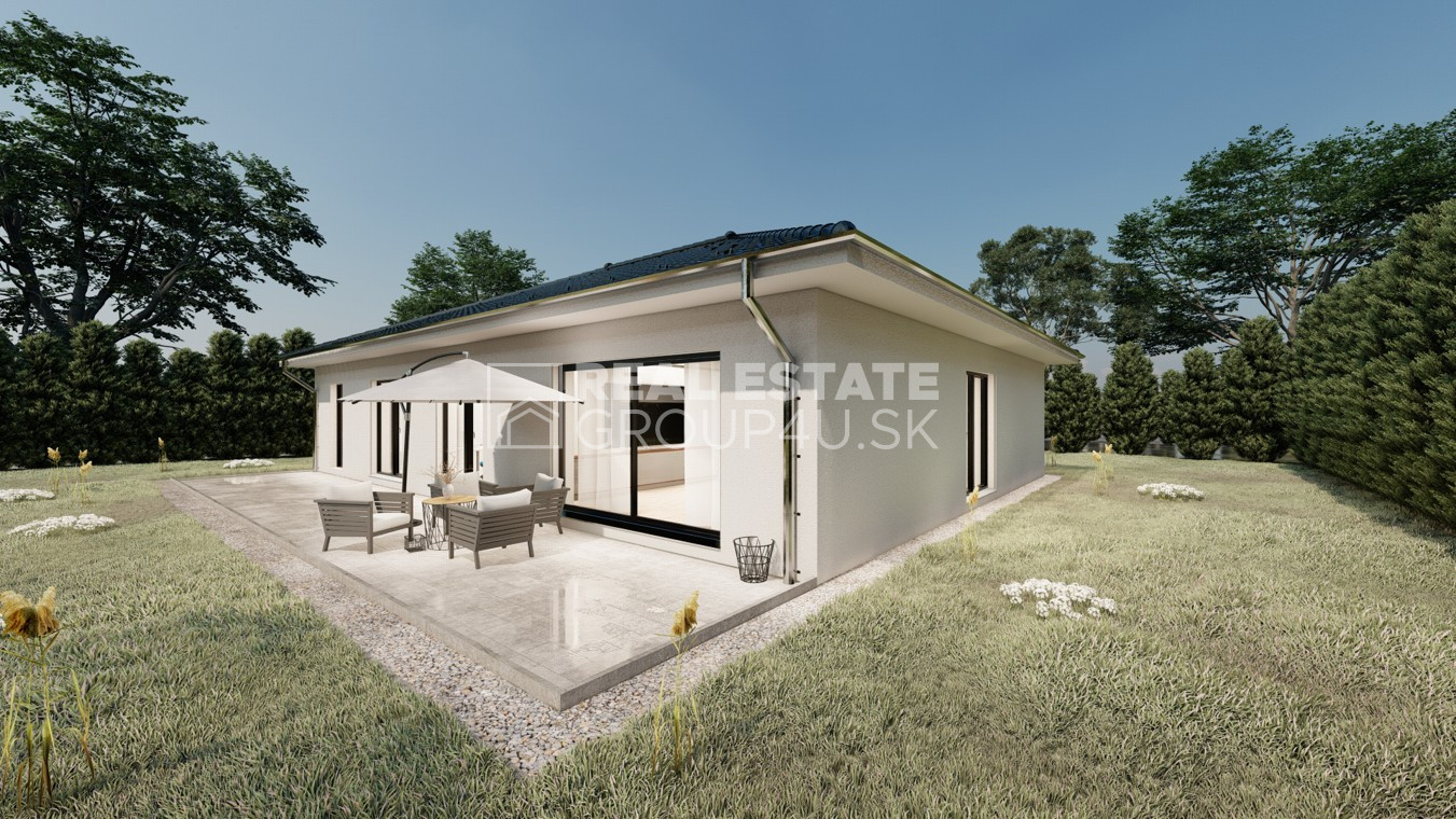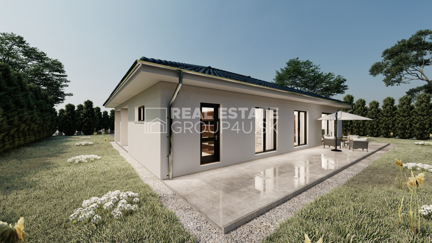 Realitná kancelária REG4U Vám ponúka na pozemku v okolí Hlohovca VÝSTAVBU RODINNÉHO DOMU - 4 izbový bungalov typ KKB 07 vhodný pre 4 až 5 člennú rodinu. Tento dom je stvorený pre rodinu, ktorá hľadá útulnosť klasického domova v modernom šate. Elegantná svetlá fasáda v kombinácii s tmavou strešnou krytinou pôsobí nadčasovo a luxusne.