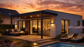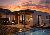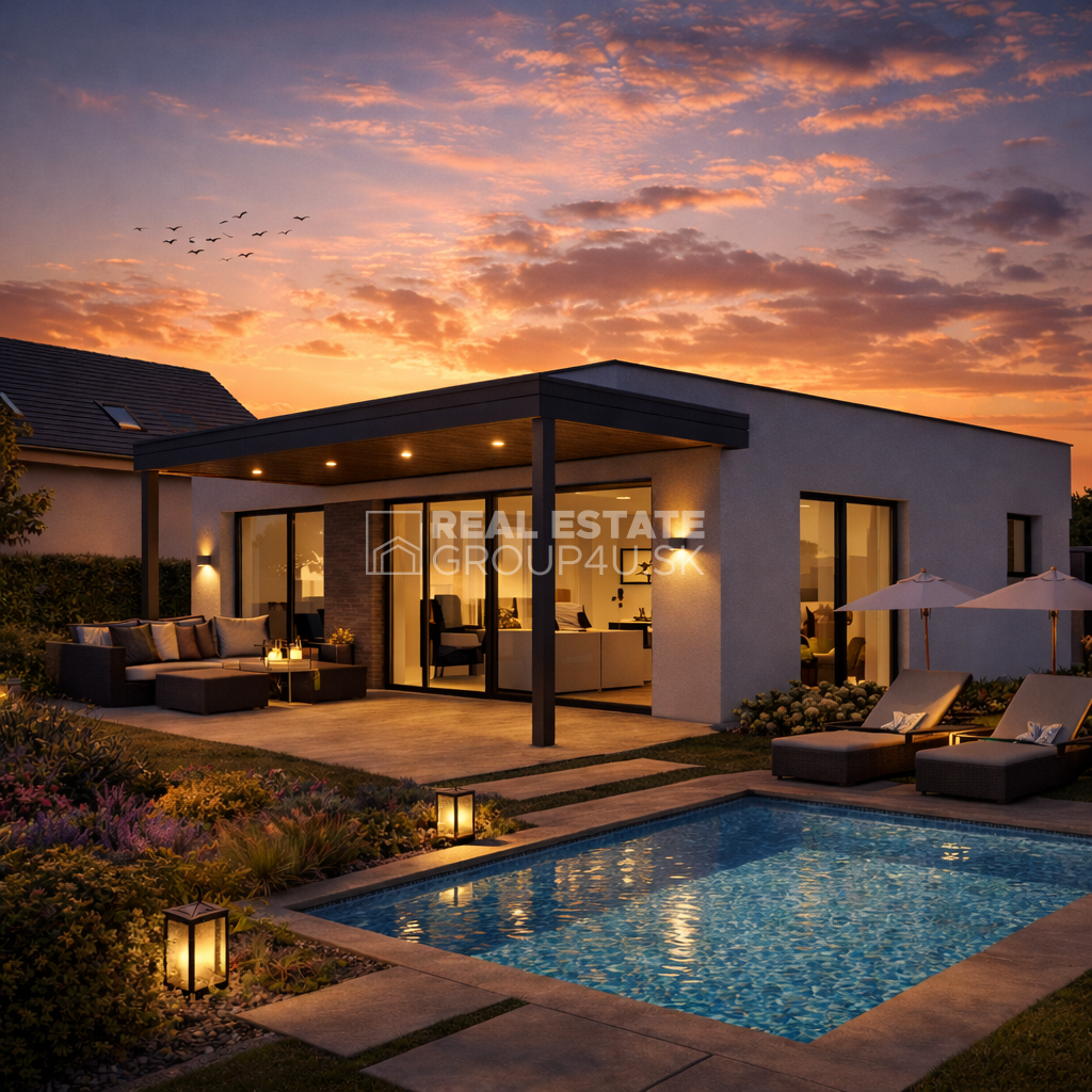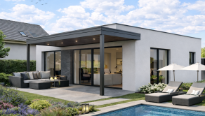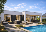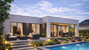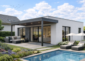 Na stavebnom pozemku sa môže zrealizovať výstavba moderného bungalovu s bazénom a klientovi ponúka ideálne spojenie komfortu, dizajnu a súkromia. Dom je riešený v čistom nadčasovom štýle s dôrazom na veľké presklené plochy, ktoré prirodzene prepájajú interiér s terasou a záhradou.