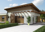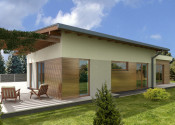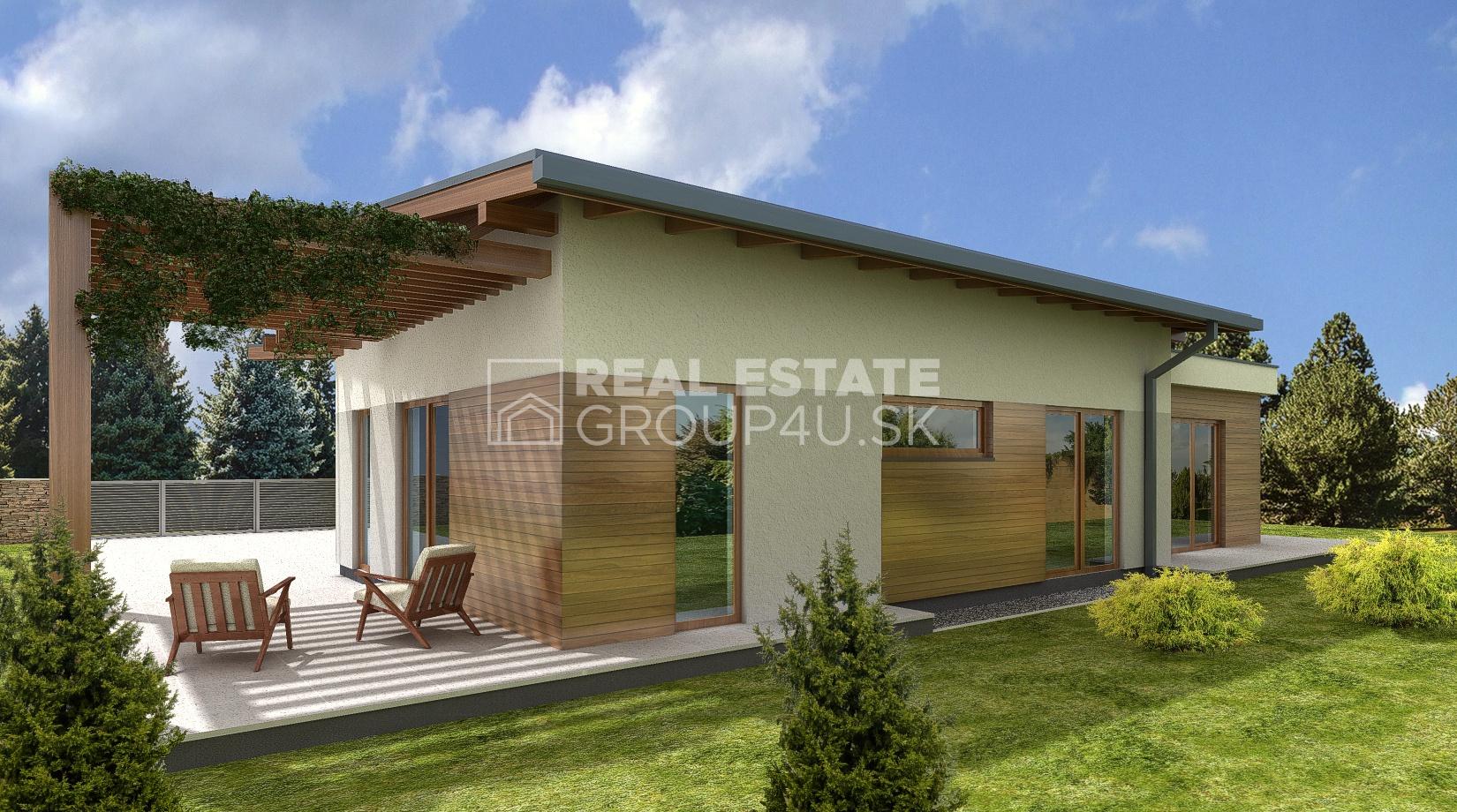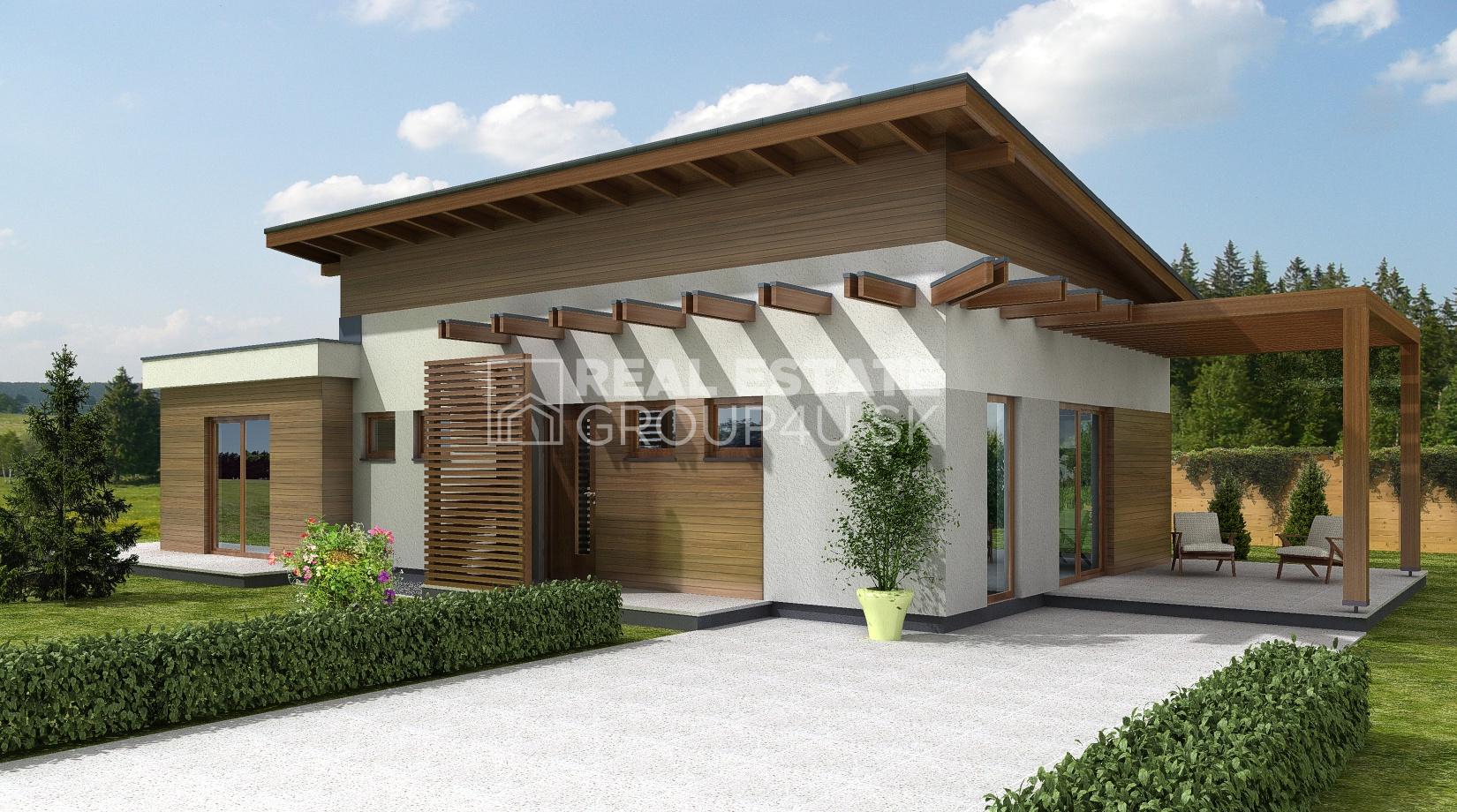 Realitná kancelária REG4U Vám ponúka na pozemku v okolí mesta Nitra VÝSTAVBU RODINNÉHO DOMU - 4 izbového bungalovu typ VDT 17 s plochou strechou, drevenými prvkami a kamenným obkladom: